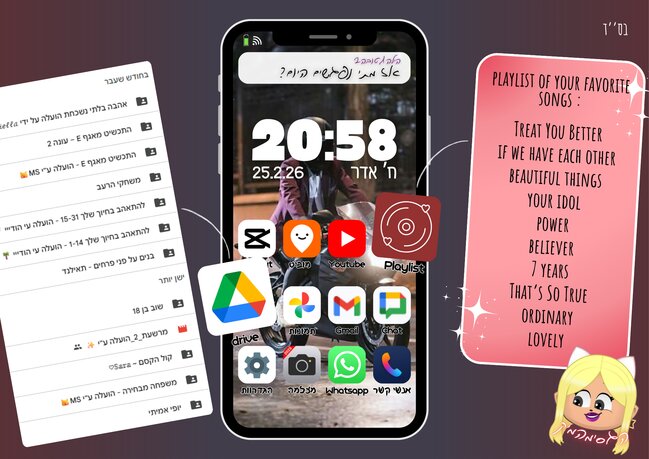 הנה אני שוב פה (. ❛ ᴗ ❛.) אזז מיקשימה וכל זה:)) הסבר קצת, יש פה כול מיני אפליציות כאלה, ויש אפליקציה קטנטנה וחמודה שאני עשיתי, קוראים לה ''Playlist'', שם את בוחרים את כל השירים שאתם הכי-הכי אוהבים, מכניסים לרשימה, וזהו! יש לכם את השירים שלכם בלי פרסומות ובלי ערבוב שירים! אפליקציית החלומות שלי (^人^) ועשיתי בגדול עוד אפליקצייה שאני ממש אוהבת, ''Drive'', זאת אפליקציה שכמו שאפשר לראות אני פשוט רואה בה מלא מלא מלא מלא סדרות שאני ממש אוהבת (תאמינו לי שאני אדבר על הסדרות האלה ביצירה שאני מכינה (●'◡'●) קיצר, מקווה לזכות, יום טוב (´▽`ʃ♡ƪ)