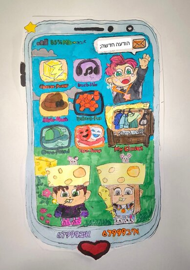 ביצירה שלי עיצבתי את מסך הבית של הסמארטפון העתידני של המיקמק שלי בסגנון צבעוני ושמח. בחרתי מסגרת בהירה עם כוכב וכפתור לב בתחתית, ורקע של שמיים כחולים ודשא ירוק כדי ליצור תחושה של עולם חי וכיפי. למעלה הוספתי שורת מצב עם 85% מיק-אנרגיה והודעה חדשה שקופצת, כדי שיראה כמו מכשיר אמיתי. במסך הבית יצרתי אפליקציות דמיוניות עם אייקונים מקוריים: Cheese-Power – אפליקציה שנותנת למיקמק כוח ואנרגיה מיוחדת כדי להצליח במשימות. Beat-Mix – אפליקציית מוזיקה שמאפשרת לשמוע שירים וליצור ביטים אישיים. Style-Flash – משנה את הלוק והבגדים בלחיצה אחת ומאפשרת ליצור סטייל חדש. Balloon-Fun – אפליקציית כיף שמוציאה בלונים צבעוניים ואפקטים שמחים מהמסך. Clone-Friend – יוצרת חבר דמיוני שעוזר ומצטרף להרפתקאות. Face-Swap – אפליקציה מצחיקה שמחליפה הבעות פנים בין דמויות. My Closet – אפליקציית הארון האישי, שבה אפשר לראות את כל הבגדים, לבחור פריטים וליצור לוקים חדשים. בחרתי להבליט את האפליקציות כך שיראו חיות וצבעוניות, והוספתי את המיקמקים שלי בתחתית המסך כדי להראות שזה הסמארטפון האישי שלהם. הרעיון הכללי הוא להציג סמארטפון עתידני שמבטא יצירתיות, סטייל אישי וכיף בעולם המיקמק.
