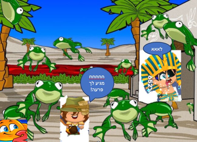 אוקיי אז מה שרואים זה שצפרדעים קפצו על פרעה שיפול ועכשיו אנחנו צוחקים עליו כי הוא סובל