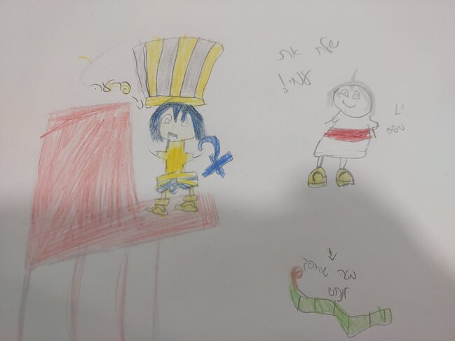 שוב למיקשימה , ציירתי את פרעה מול משה והמטה שהופך לנחש, משה אומר לפרעה "שלח את עמי"