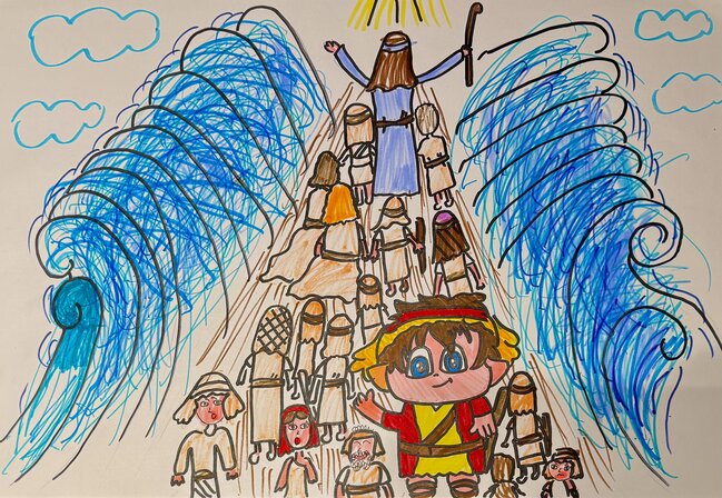 אני מאוד אוהב לצייר אז ציירתי את החלק האהוב עליי בסיפור יציאת מצרים - קריעת ים סוף והכנסתי את בוקי לתוכו מנופף שלום לתמונה יחד עם עוד כמה עברים ששמו לב למצלמה