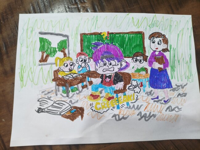 אני ציירתי את הדמות מיקמק שלי יושבת על הכיסא בכיתה ובום הכיסא זז טיפה אחורה וזה משמיע קול מביך אתם נבוכים וכל הכיתה כולל המורה מסתכלים ומופתעים ממני