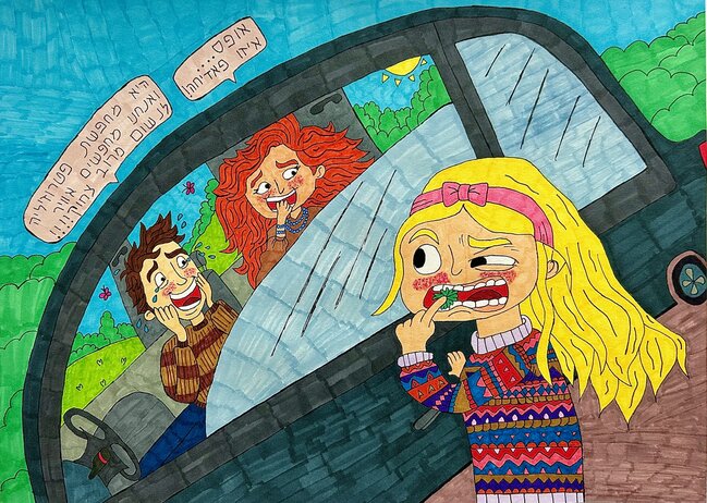 היי צבצבים! מה המצב? זה הציור שלי למיקשימה החודשית- "אופס... איזו פאדיחה!" מכירים את זה שאתם הולכים בכיף שלכם, ופתאום משהו קטן שתקוע בשיניים פשוט לא עוזב? בציור קלטתי חלון כהה של אוטו וחשבתי שמצאתי את המראה המושלמת. נעמדתי מולו, פתחתי פה ענקי והתחלתי במבצע חילוץ נועז של פטרוזיליה עקשנית שנתקעה לי בשיניים מאז ארוחת הצהריים... בשיא הריכוז והפרצופים המוזרים, החלון פתאום ירד! קלטתי שיש אנשים בתוך האוטו שפשוט נקרעו מצחוק מההופעה שנתתי להם, ובאותו רגע כל מה שעבר לי בלב זה: "אופס... איזו פאדיחה!" אבל אז פשוט צחקתי יחד איתם. הבנתי שכל פדיחה היא בסוף הזדמנות לחיוך טוב על הלב, והחלטתי להפוך את המבוכה לצחוק- כי הכל בחיים זה עניין של זווית ראייה. לפעמים היקום שולח לנו פאדיחה קטנה רק כדי שנזכור לקחת הכל בקלילות ולהפיץ קצת שמחה מסביב. מקווה לזכות השקעתי המון זמן ומחשבה ביצירה. אני מקווה שהציור והסיפור יעשו לכם טוב על הלב כמו שהם עשו לי.
