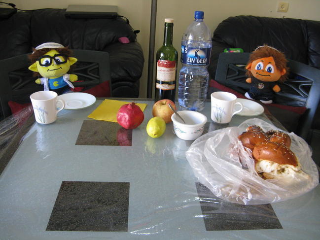 התגעגתם? חזרתי עם תמונה של מקס וסאני בארוחת החג.בתמונה רואים את שמקס וסאני ערכו את שולחן החג . וגם רואים רימון,תפוח בדבש ולימון,בתמונה מקס עושה קידוש עם היין.עבדתי קשה תגיבו אם אהבתם(: